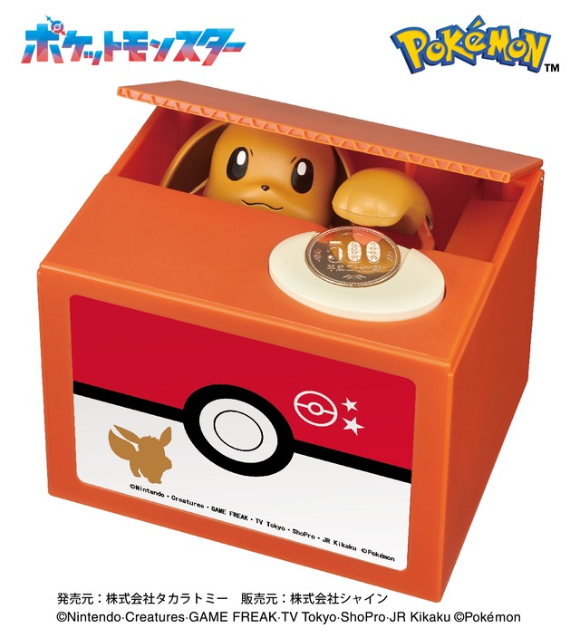本商品は海外への販売はできません。 【サイズ】 幅120×高さ100×奥行100(mm) 【素材・成分】 本体:ABS 滑り止め:SEBS 電源スイッチ:POM 【コメント】 ・イーブイが貯金箱になって登場! ・コインをお皿に置くと、おしゃべりしながらイーブイが登場。 ・コインを取って隠れちゃいます。 ・動作には単三乾電池が2本(別売り)必要です。 ・発売元:株式会社タカラトミー 販売元:株式会社シャイン ©Nintendo・Creatures・GAME FERAK・  TV Tokyo・ShoPro・JR Kikaku ©Pokémon