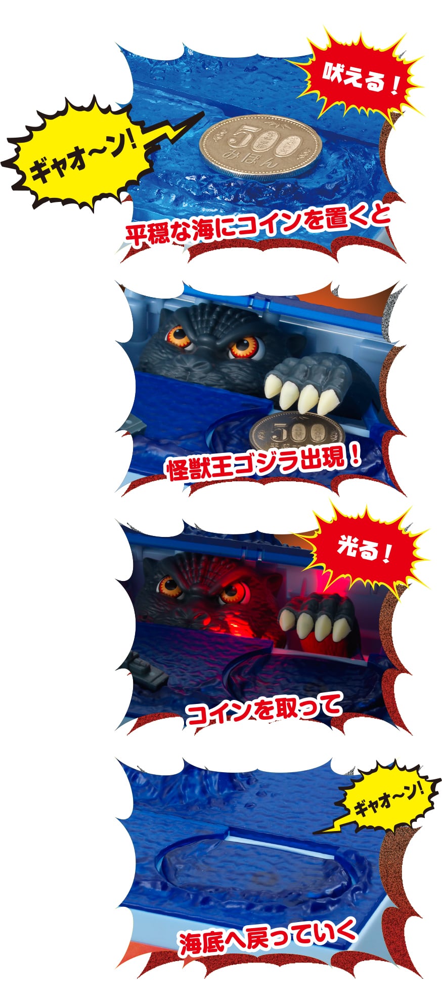 ・コインを置くと、ゴジラが吠えて水面から顔を出し、コインを取って海へ帰っていきます。